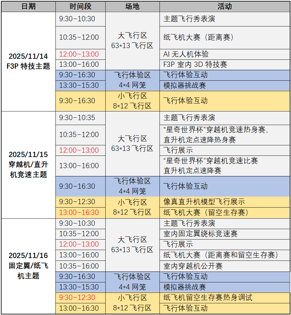 这是一场属于所有飞行爱好者的年度盛宴,也是与各厂商、品牌零距离接触交流的绝佳机会 —— 3 片共计2000平米室内飞行区坐镇现场,既能看遍炫酷飞行器炸场表演,更能见证年度规模 TOP1 的室内赛事:F3P 3D 特技赛、直升机定点速降赛、穿越机竞速公开赛轮番开战,还有超解压的纸飞机留空生存赛 & 距离赛等你来挑战!更有 N 多种无人机互动体验,高手切磋、小白尝鲜都能嗨,现场还有亲子飞行体验活动,积分打卡换礼!千万别错过!错过再等一年哦!